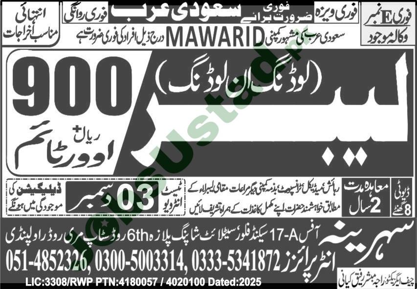 This urgent requirement for Loading and Unloading Labor with MAWARID in Saudi Arabia is an excellent financial proposition for physically fit Pakistani workers. The combination of a stable 900 SR basic salary, high guaranteed overtime, and zero living expenses (free food and accommodation) makes this a premier opportunity for saving and earning. Interested candidates must ensure they are available to attend the critical walk-in interview on December 3, 2025, at Sehreen Enterprises in Rawalpindi.