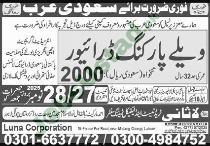 There is an urgent requirement for a well-reputed company in Saudi Arabia seeking qualified individuals to join their team. This is a fantastic opportunity for Pakistani nationals who possess excellent driving skills and a professional demeanor. The recruitment is being managed by Luna Corporation and Lathani Trade Test & Technical Training Center. The specific role available is for a Valet Parking Driver. This position offers a competitive salary package along with standard benefits as per Saudi Labor Law. The hiring process is currently active, and interested candidates are encouraged to prepare for the upcoming walk-in interviews in Lahore.